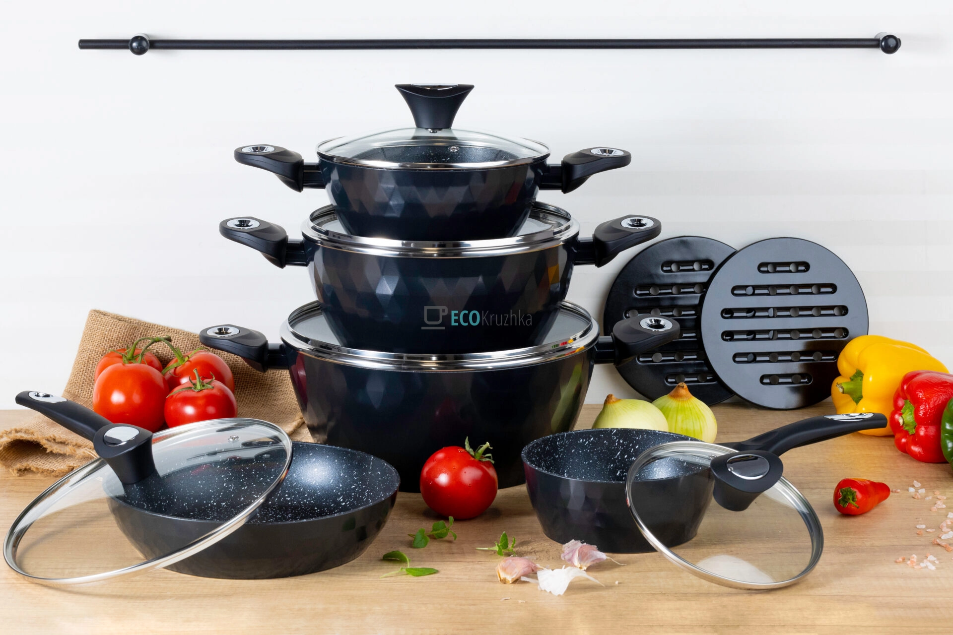 Набір складається з литого алюмінію з антипригарним мармуровим покриттям, що не тільки виглядає чудово, але й гарантує легке приготування страв без пригорання. Чорний колір посуду додає елегантності та сучасного вигляду на вашій кухні.