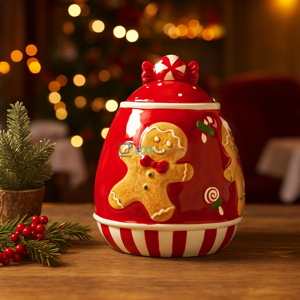 Яскравий дизайн: Банка у вигляді "Веселі пряники" не тільки зберігає солодощі, але й стає прикрасою кухні або вітальні 🎨. Вона додасть простору святкової атмосфери та позитиву.